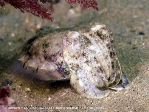 Biotope: depuis la surface jusqu'à 200 m de profondeur environ. La seiche est observée occasionnellement sur la roche, mais elle sera le plus souvent rencontrée sur des fonds meubles, sable ou graviers, dans les herbiers ou parmi les algues de grande taille. Les individus les plus fréquemment rencontrés mesurent de 15 à 30 cm (tentacules longs de même longueur que le corps, non inclus). La taille maximale est de 45 cm. [photo copyright Benjamin Guichard/Agence des aires marines protégées]